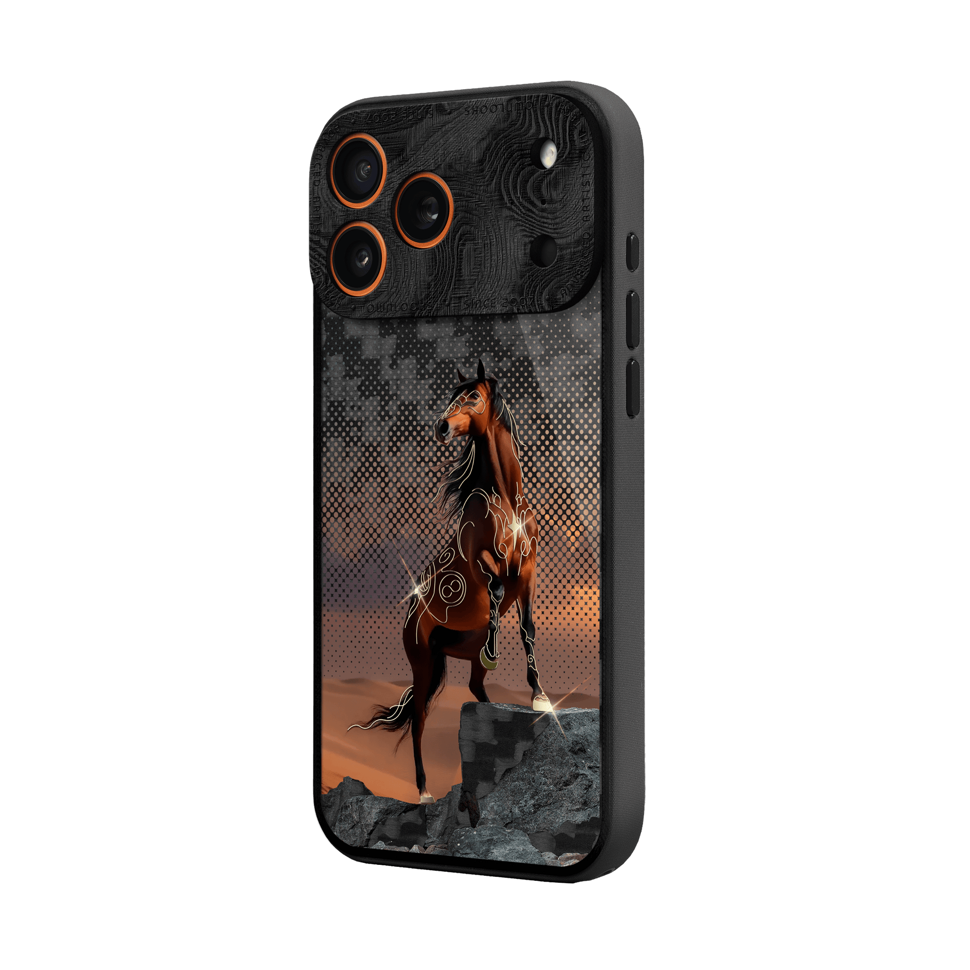 Eco-leather or recycled polyester sides paired with an artistic carbon fiber back featuring an artwork of an elegant Horse adorned with silver coloured metal elements and layers of jewellery-grade lacquer