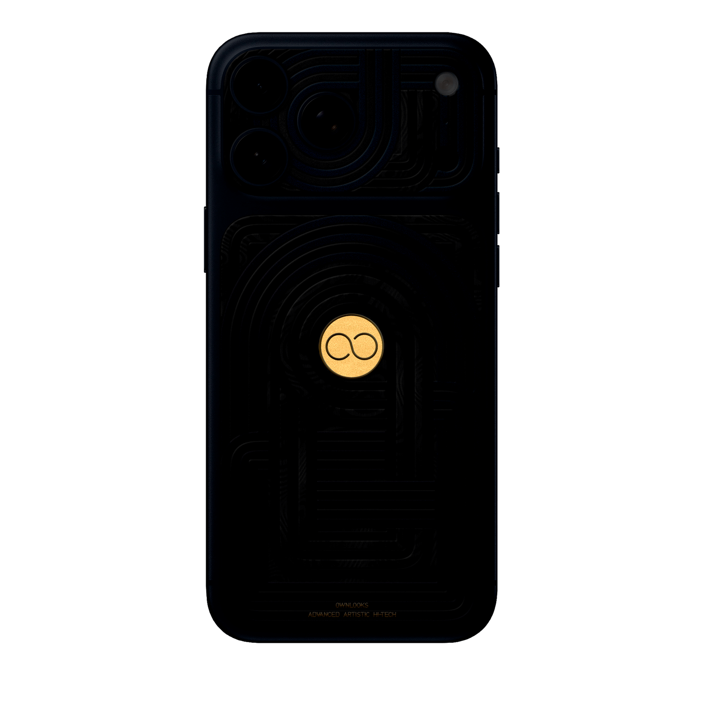 This is Asterion Duochrome — a dark blue and black ornament combining the jewellery enamels and our new composite material lines woven into the body of Damascus carbon panel involving marquetry technique. Our proprietary backlight under the sapphire crystal logo turns on in parallel with the screen.