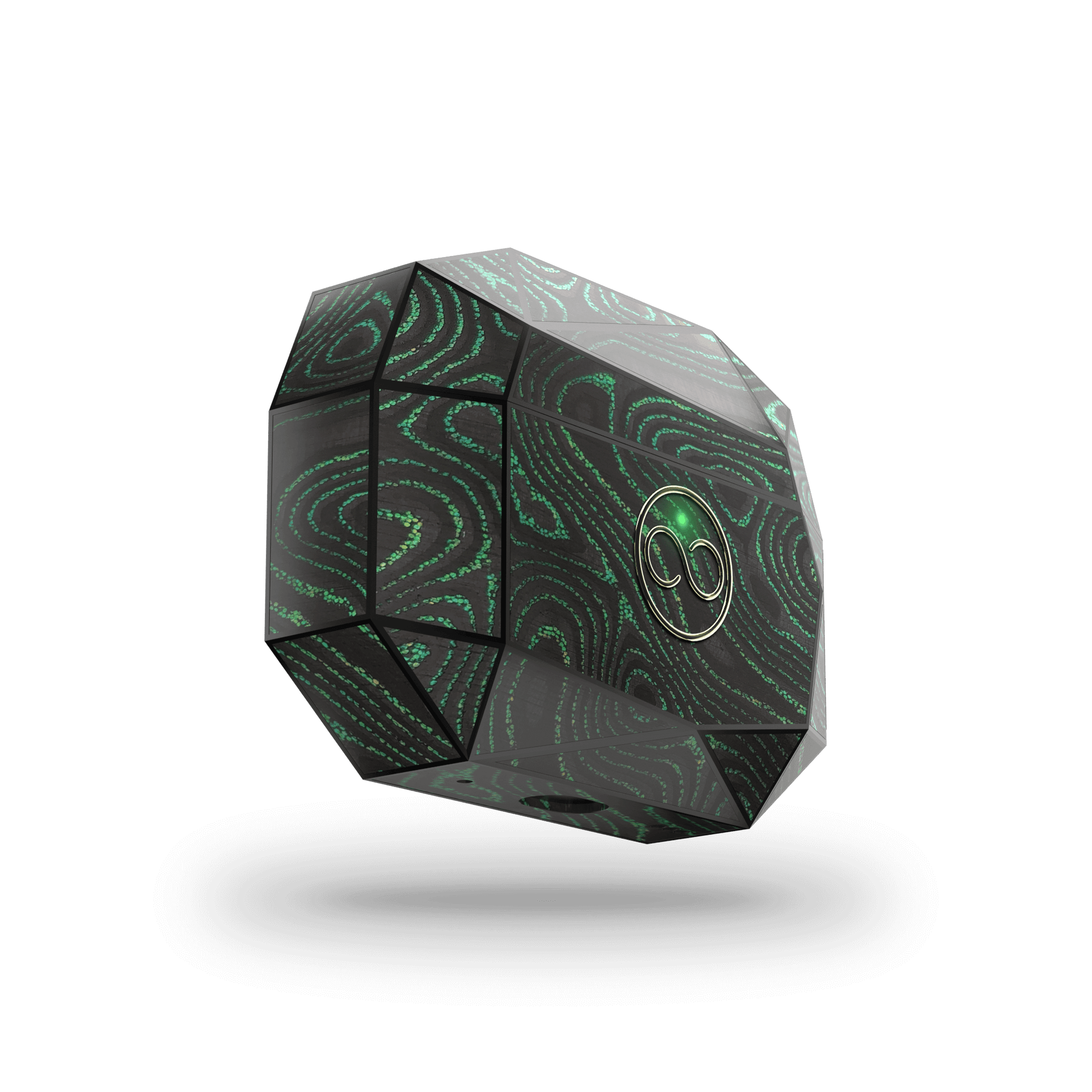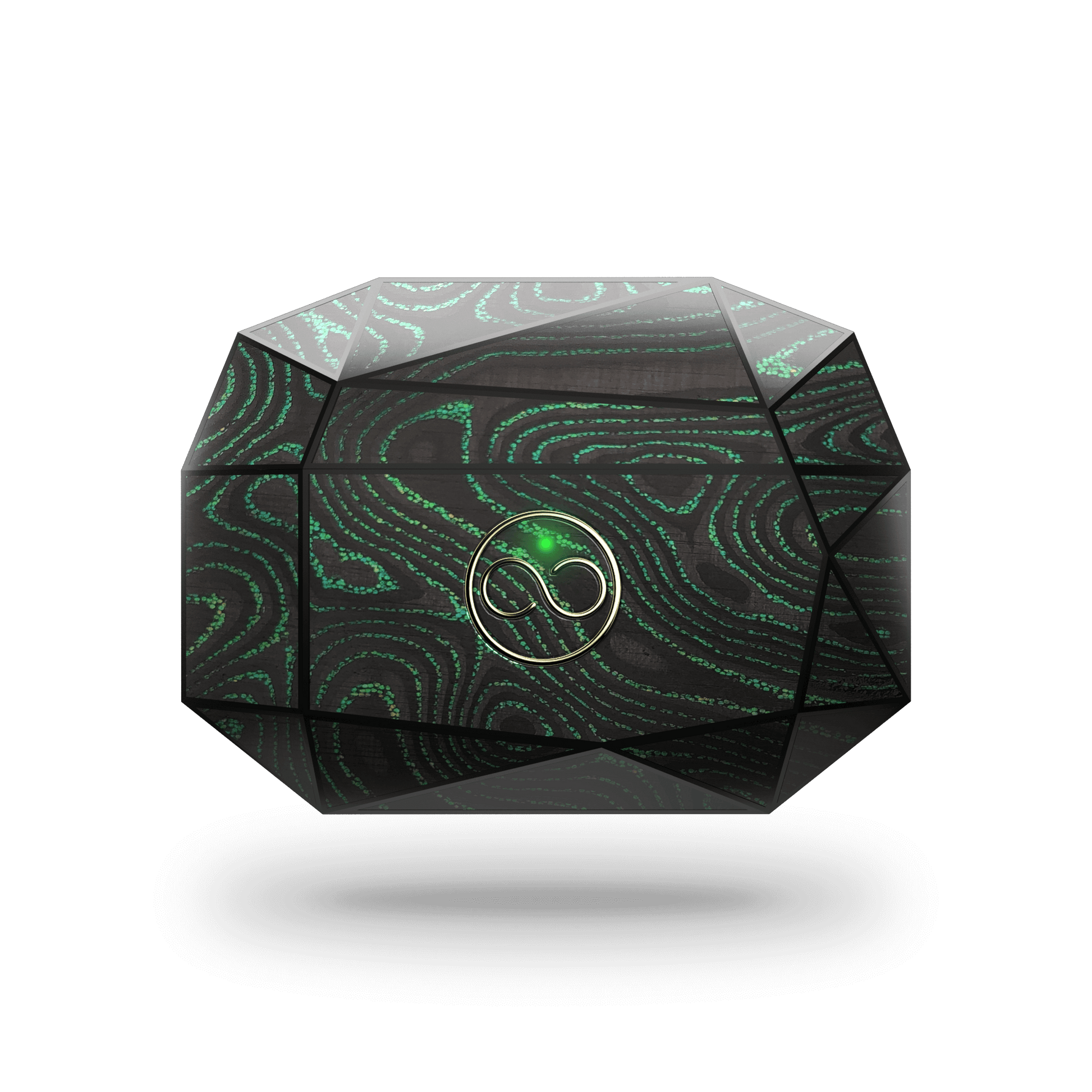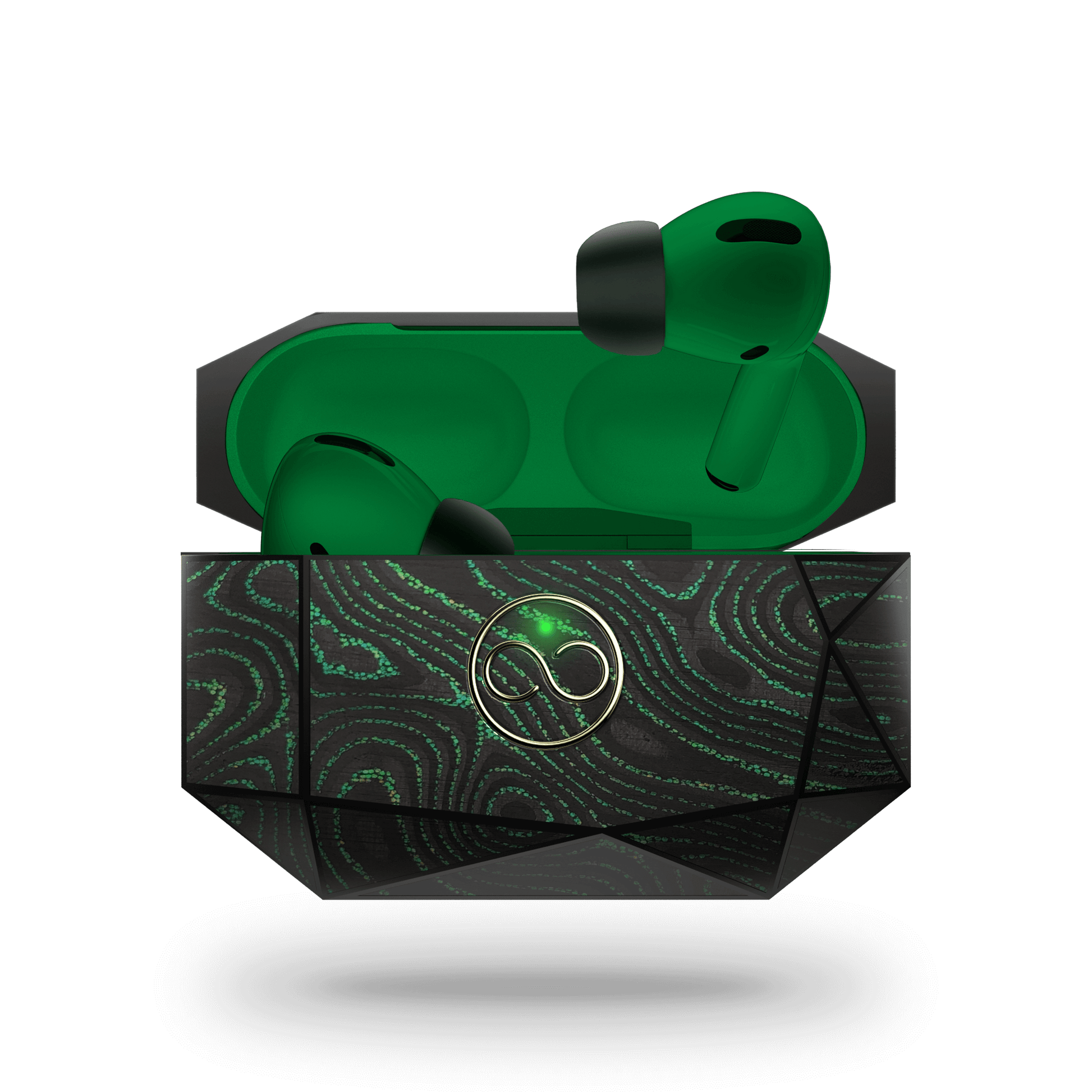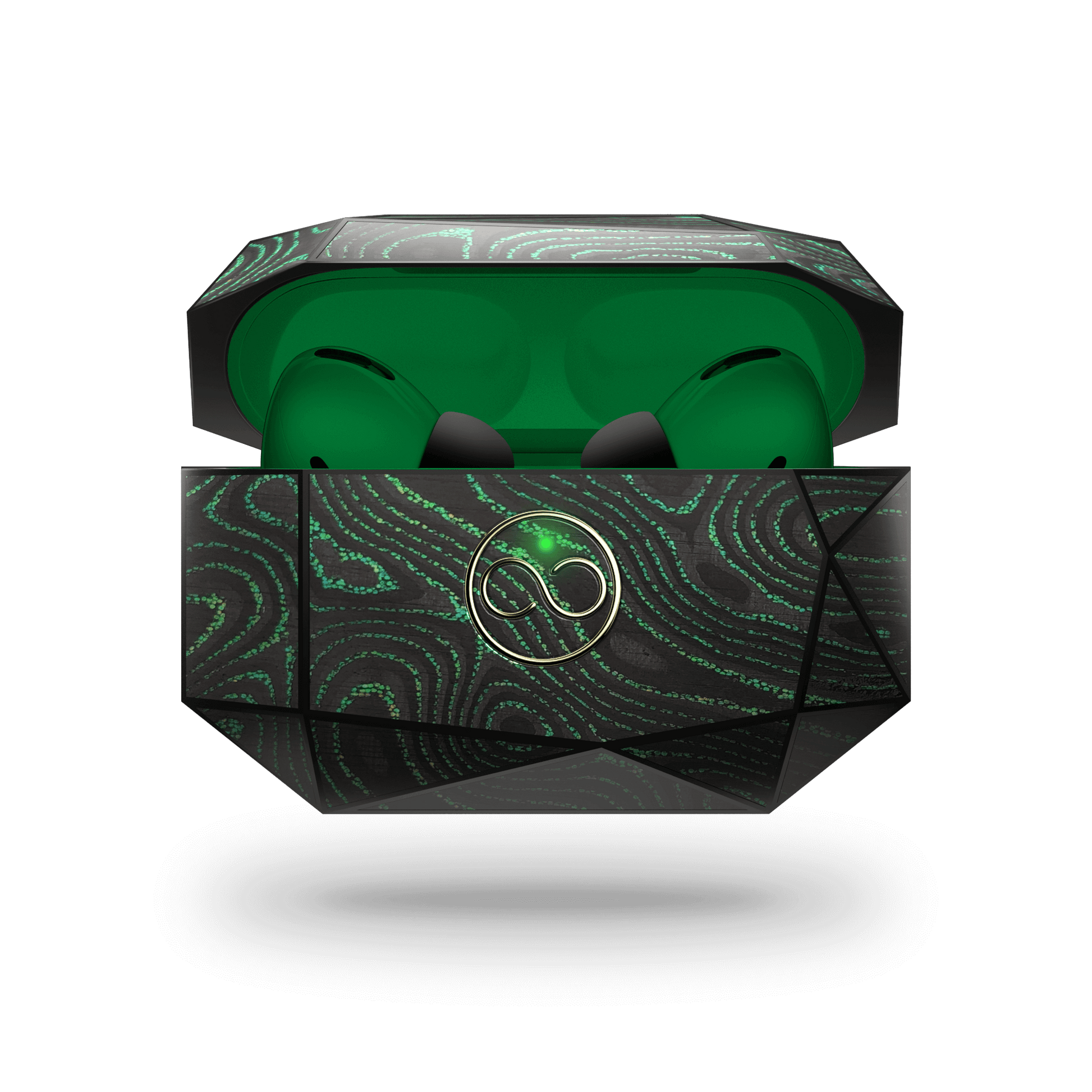 OWNLOOKS ventures into a multidimensional travel introducing this Kaleidoscopic otherworldly shape of AirPods casing, consisting of multiple uneven Emerald Glow colored Carbon polygons. Held together by a meticulously hand-crafted epoxy resin mold, they form an asymmetrical but utterly elegant structure, encasing AirPods painted with several layers soft aesthetic lacquer tone-matching the Carbon outside.