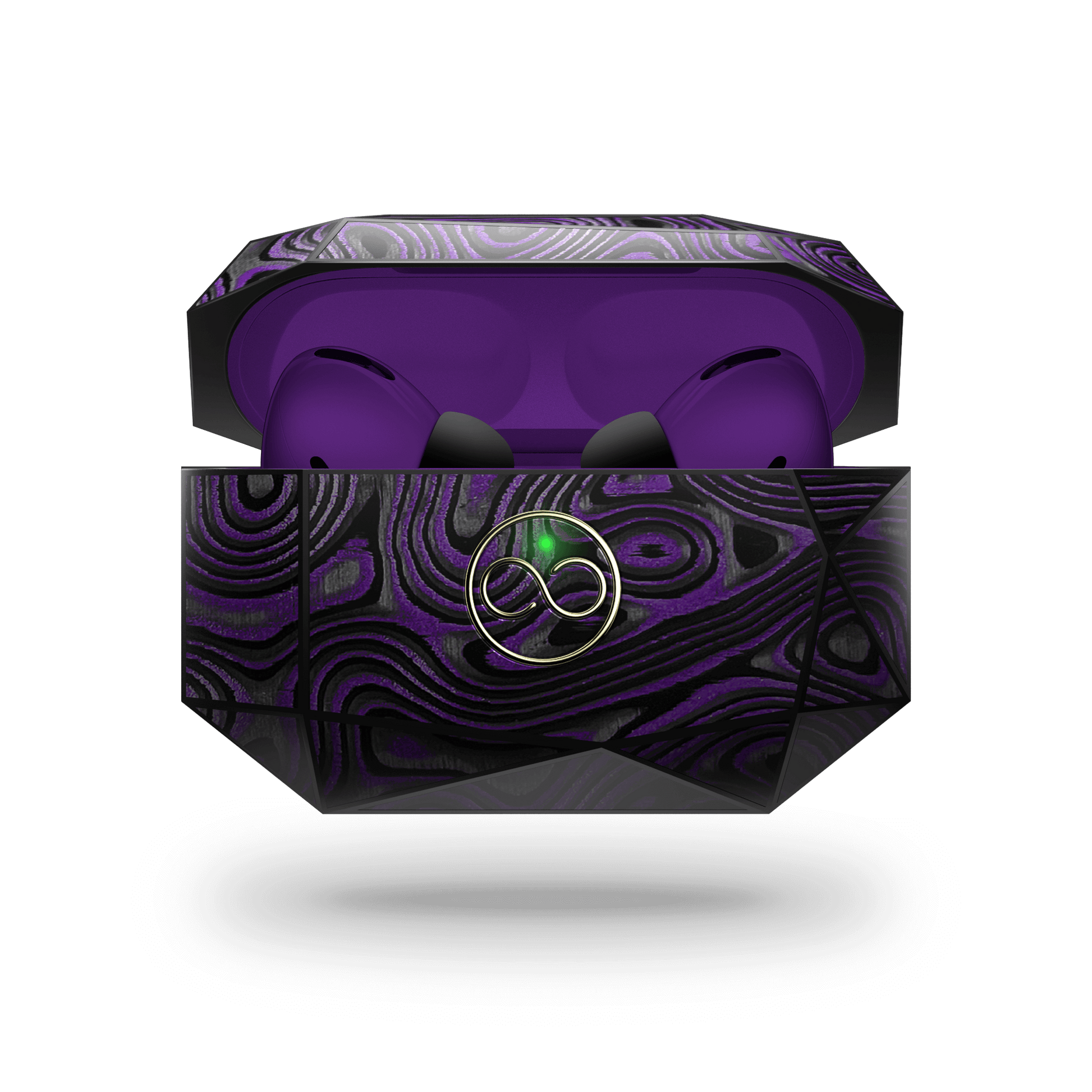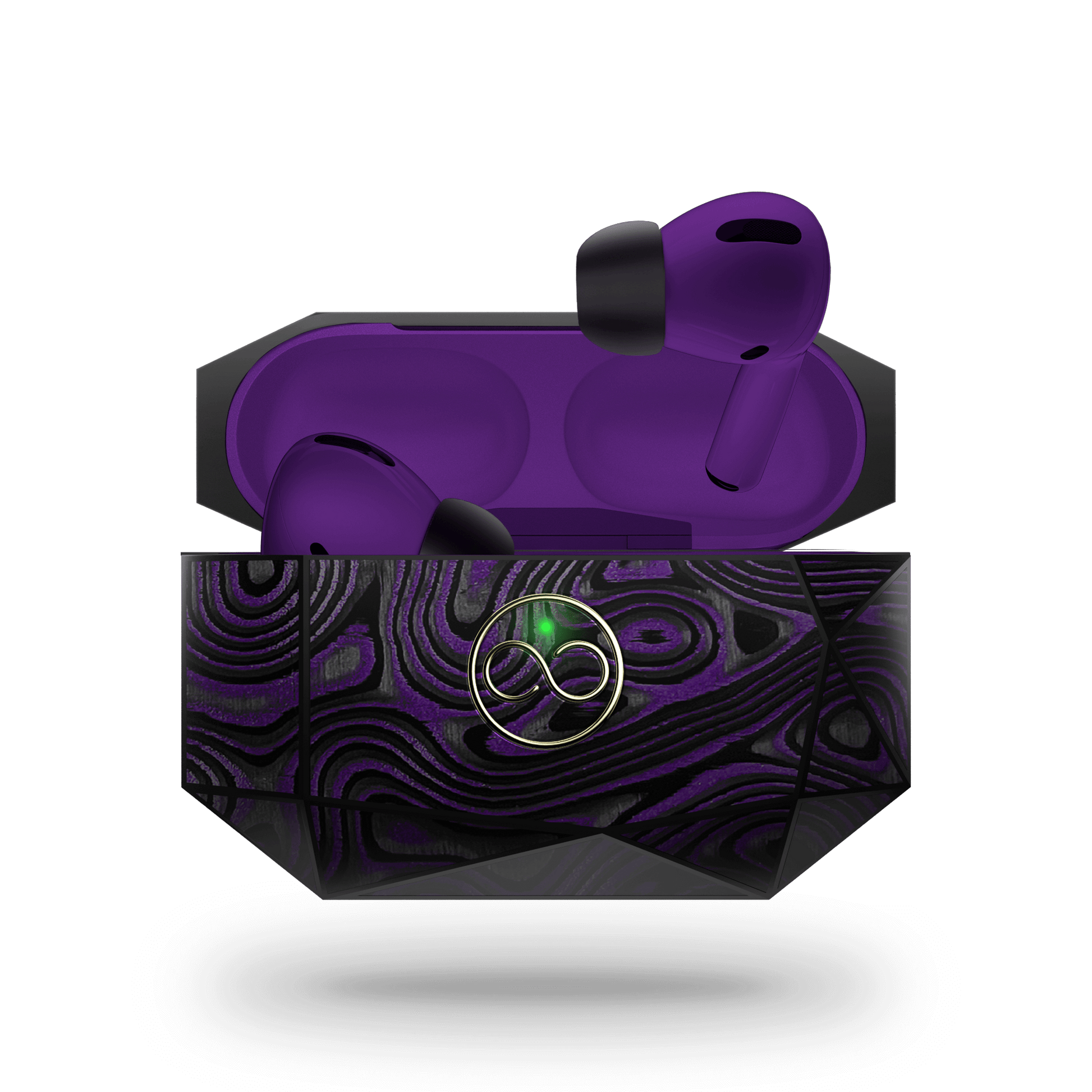 OWNLOOKS ventures into a multidimensional travel introducing this Kaleidoscopic otherworldly shape of AirPods casing, consisting of multiple uneven Deep Purple colored Carbon polygons. Held together by a meticulously hand-crafted epoxy resin mold, they form an asymmetrical but utterly elegant structure, encasing AirPods painted with several layers soft aesthetic lacquer tone-matching the Carbon outside.
