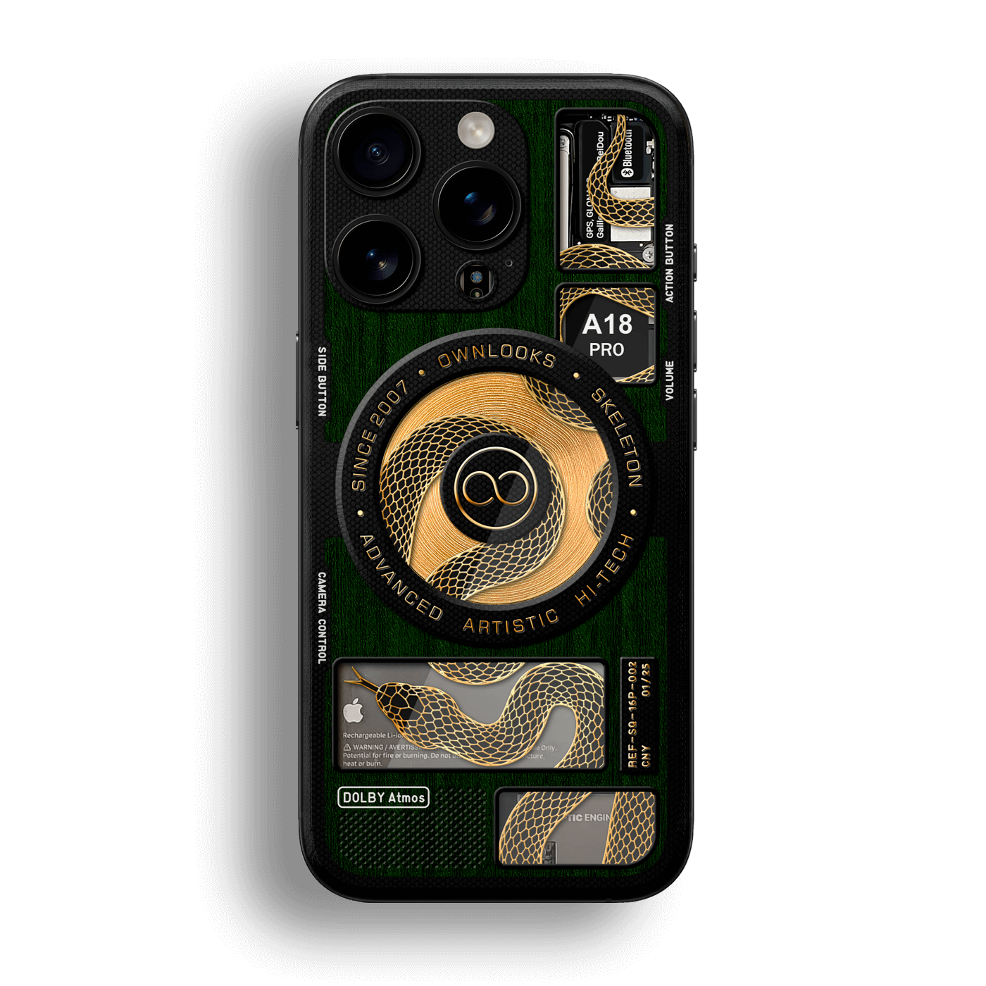 Lunar New Year edition of our updated Skeleton design features an intricate metal snake slithering through the insides of your phone, revealing its parts under the sapphire windows. Green Koto wood is used for the backpanel to celebrate the Year of the Green Wood Snake.